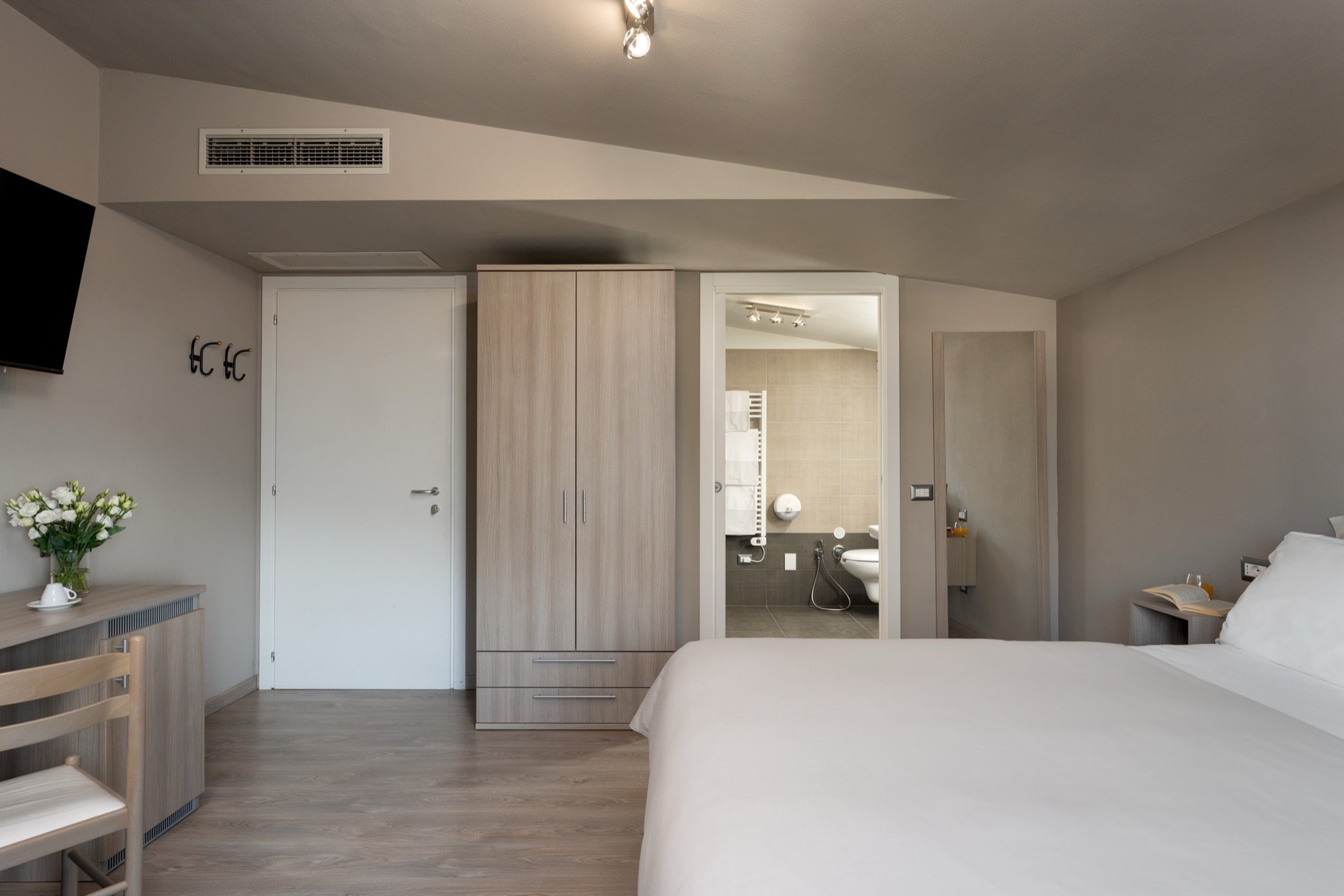 La zona notte è luminosa e ampia, tanto da contenere un letto matrimoniale, un letto singolo e una comoda poltrona-letto singola e dare a tutti gli ospiti lo spazio necessario. Anche il bagno ha una superficie grande (5,50 mq) e tutti i comfort necessari per consentire l’accesso anche a persone in carrozzina: lavabo, wc con maniglia, bidet e doccia. La stanza è infatti progettata per accogliere all’occorrenza ospiti con disabilità, permettendo loro di muoversi senza difficoltà, ed è raggiungibile direttamente con l’ascensore, al secondo piano dell’albergo.