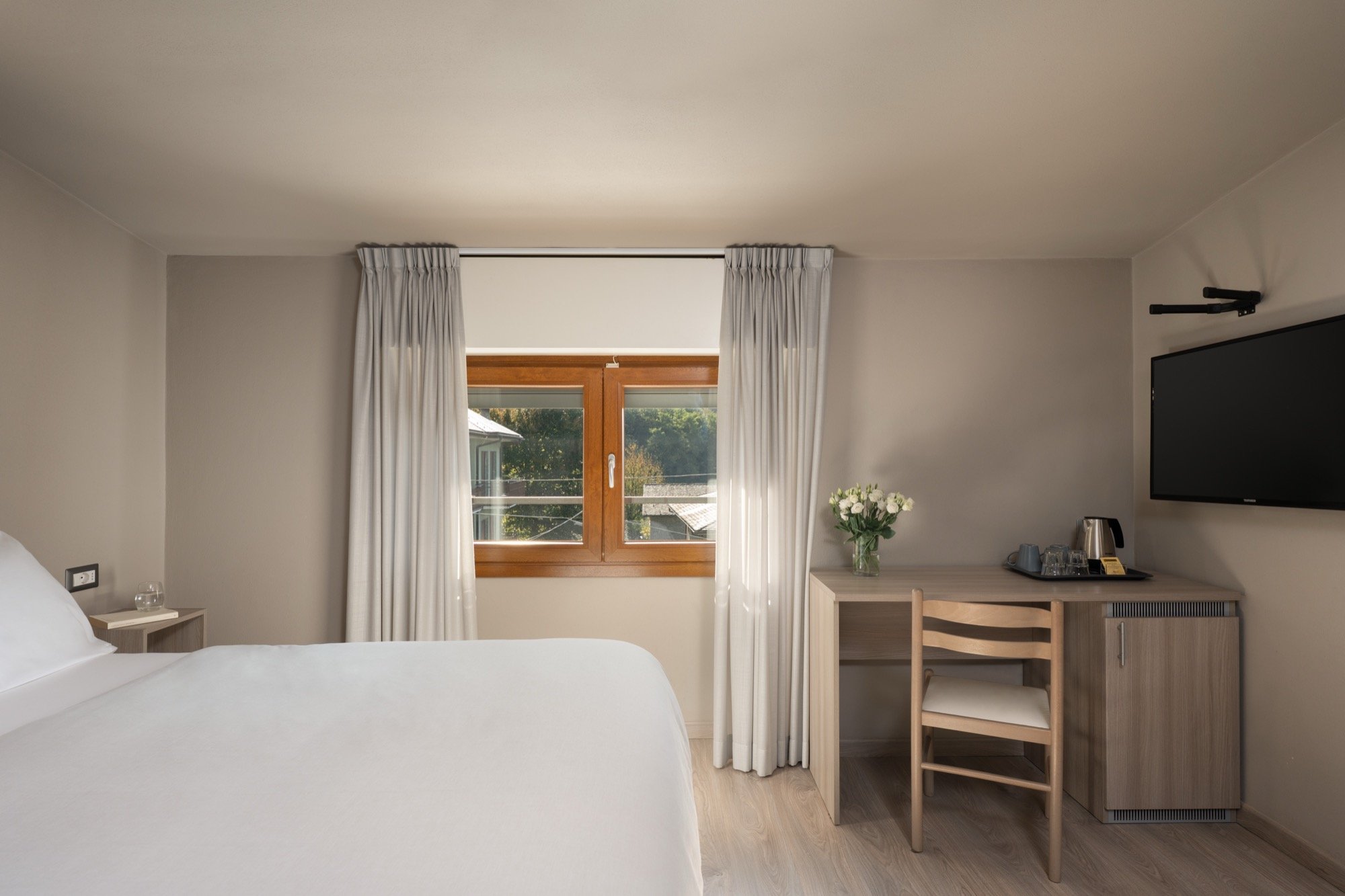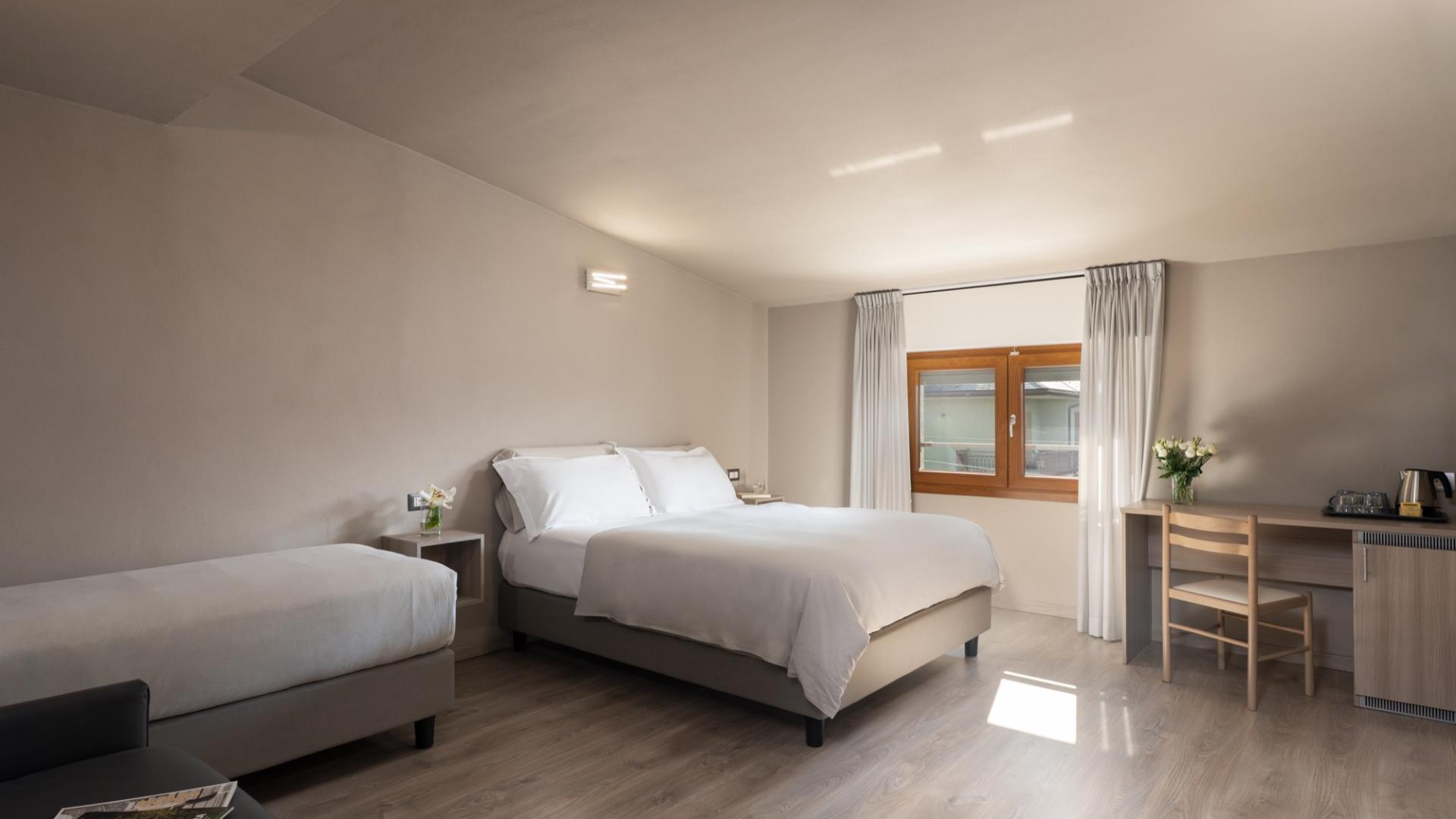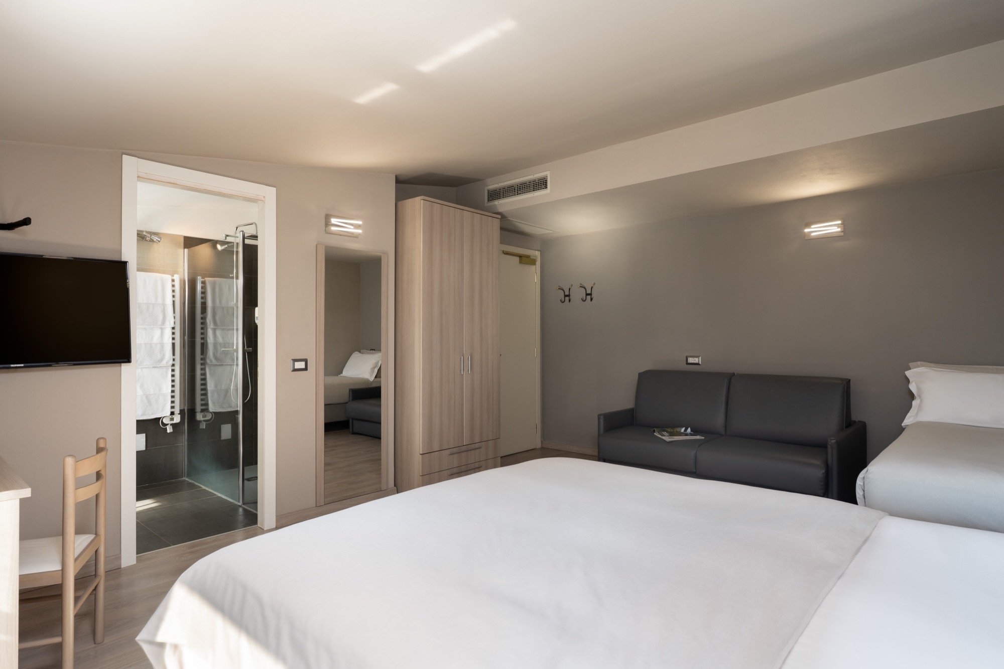 Un soggiorno in Valchiavenna con tutta la famiglia è un’ottima scelta per una vacanza in montagna sulle Alpi, in estate come in inverno: per renderla davvero piacevole e rilassante, però, è importante trovare una sistemazione che metta tutti a proprio agio – grandi e bambini – e conceda ad ognuno lo spazio e la privacy desiderati. La camera famigliare San Fedelino al secondo piano dell’Hotel Saligari è pensata proprio per mettere a disposizione di genitori e figli spazi molto ampi, come testimoniano i 23 mq della zona notte, e tutti i migliori comfort, a cominciare dal letto matrimoniale, dal comodo divano-letto doppio e dal letto singolo che portano la capienza della stanza a 5 persone.